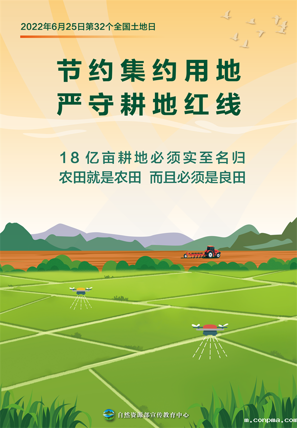 2022年6月25日是第32个全国土地日,6月23日至6月29日是全国土地日主题宣传活动周,今年的宣传主题是“节约集约用地 严守耕地红线”。值此之际,自然资源部宣传教育中心策划制作了4组宣传海报,希望全社会树立节约用地、保护耕地的意识,像保护大熊猫一样保护耕地,让每一寸土地都成为丰收的沃土。
